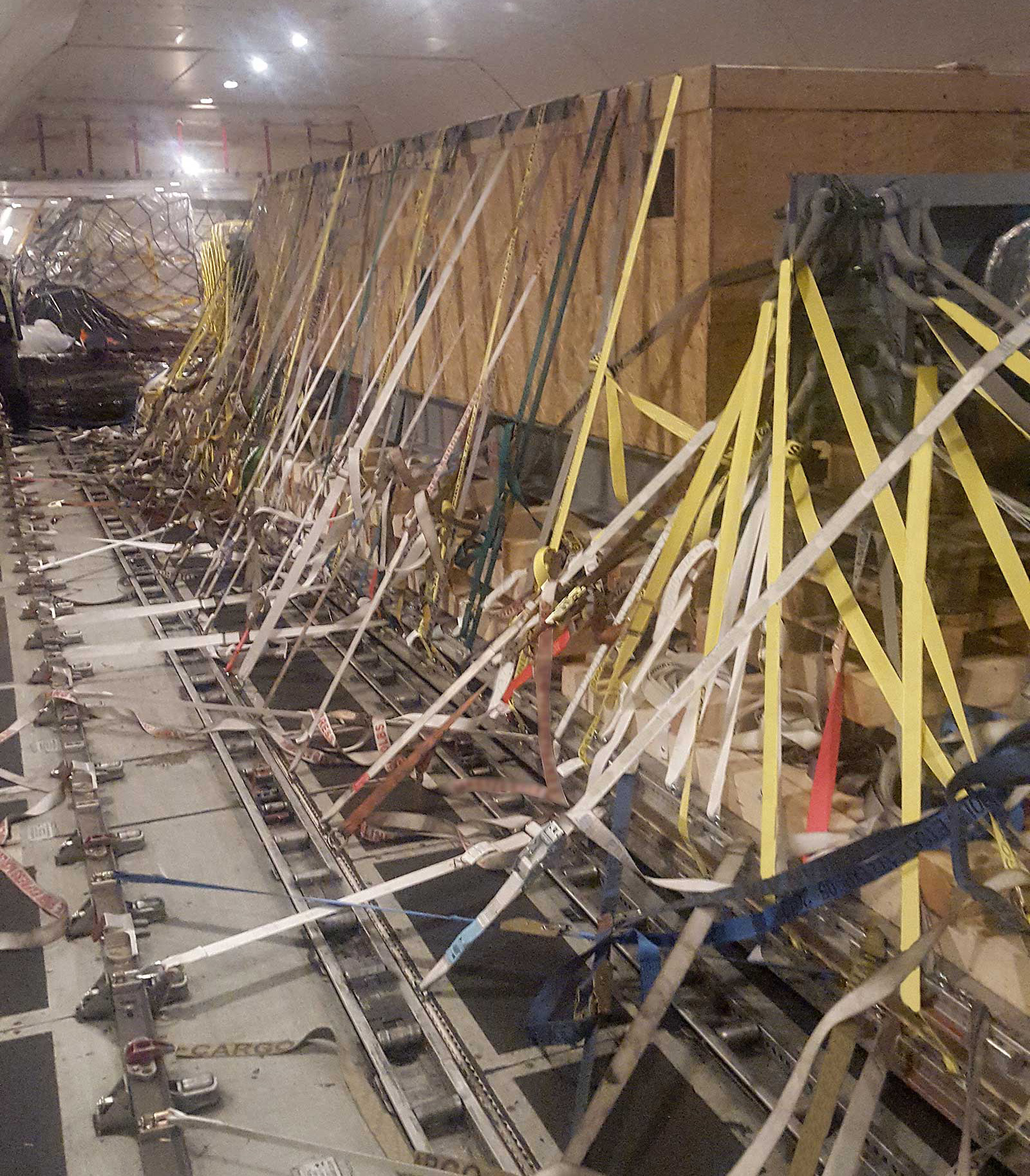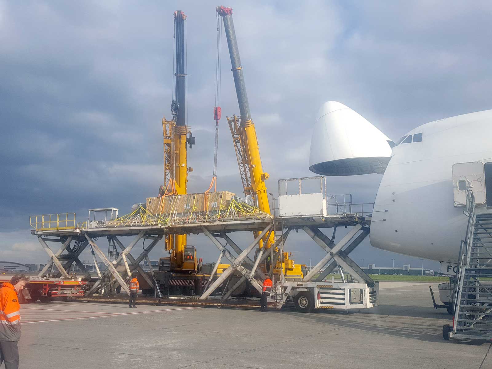 Due to its weight, two heavy-weight cranes (50 tons) and two high-capacity loaders were also necessary to safely load the cargo onto the aircraft.